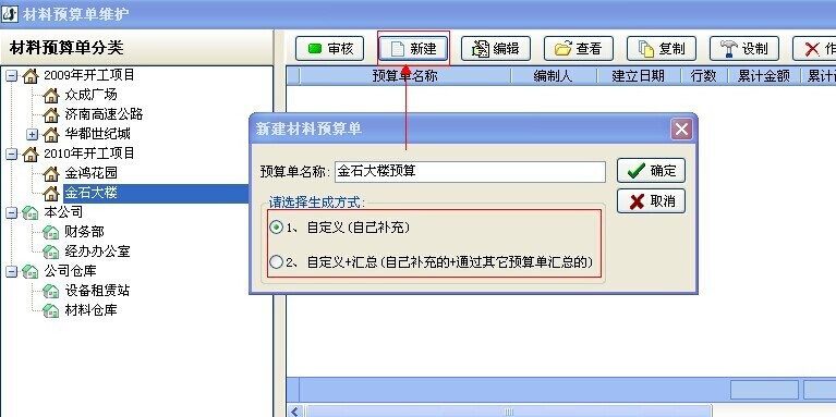 1. 打開【材料管理】模塊中【材料預算單】,選中項目后點擊【新建】按鈕創建材料預算單。