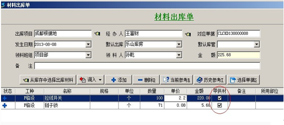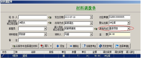 3. 【材料調(diào)撥單】主要用于:項目與項目之間的材料調(diào)撥,或公司總庫與項目之間的材料調(diào)撥。在填寫時要選擇好調(diào)出項目和調(diào)入項目。調(diào)出項目有兩種出場方式:庫房調(diào)出和班組繳料,調(diào)入項目有兩種進場方式:調(diào)撥入庫和直進項目。進場方式選擇直進項目時,明細中的材料金額會進入調(diào)入項目的成本中。如果調(diào)出項目,出場方式選擇的是班組繳料,也就是從項目現(xiàn)場直接調(diào)出的,這時調(diào)出項目的成本中會減去明細中材料的金額。