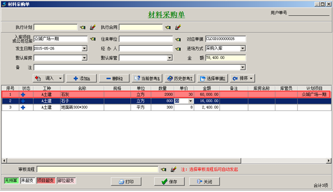 1、利用程項目材料預算單制訂出項目中材料的目標成本,每種材料的目標用量。有了該目標用量、目標成本就可以控制現場材料的超支采購的預警功能,及事后查詢功能,從而控制采購避免超支浪費、不但實現了量的控制,也實現了價的控制。