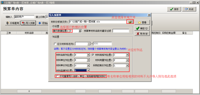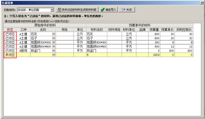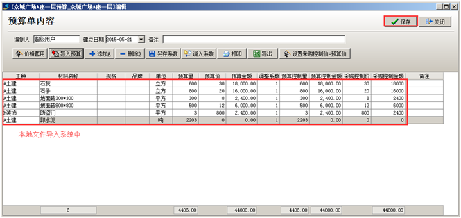 第三步,列名對應好之后點擊[確定],將本地Excel中的內容導入到系統中,如果預算單中存在與原始庫中未對應的材料,可對應之后[確定導入](對應好之后后期如果有同樣的材料出現可自動對應),確定導入之后,文件中的內容導入到系統中,點擊[保存]按鈕保存當前材料預算單,如圖: