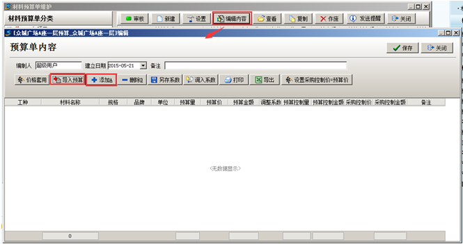 第二步,預算單名稱維護好之后,選中預算單點擊[編輯]的按鈕編輯“材料預算單”內容,編輯預算單內容有兩種方式,可“導入預算”或者點擊[添加]的按鈕直接選擇預算材料,如圖: