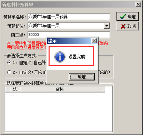 編輯材料預算單的基本信息,基本信息輸入完成之后點擊[確定]的按鈕,彈出“設置完成”的提示,如圖: