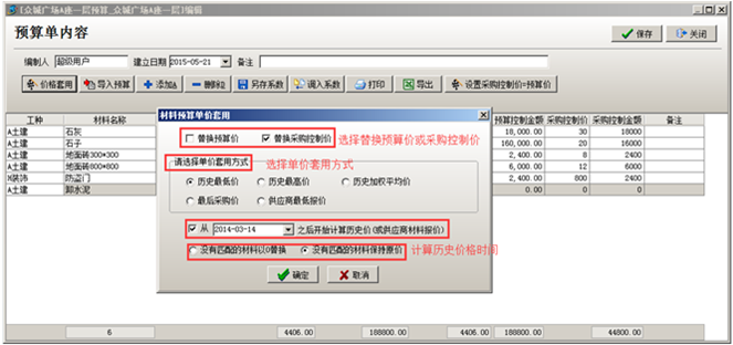 在進行材料預算編輯時,工程項目材料預算的單價可套用歷史采購價價格。點擊“價格套用”,選擇好替換“預算價”或“采購控制價”,選擇單價套用方式,以及沒有對應材料時的替換方式,替換完成之后點擊確定,系統按照選擇的條件將價格進行替換。如圖: