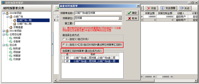 注:選擇第二種生成方式之后,在下面選擇匯總的預算單,確定之后會將選定的預算單內容匯總到當前預算單中。