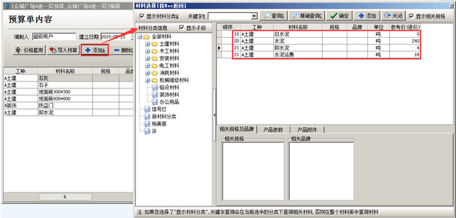 也可以點擊[添加]的按鈕,從材料庫中添加雨點材料到預算單中。點擊[添加]的按鈕,雙擊材料添加到預算單中,如圖: