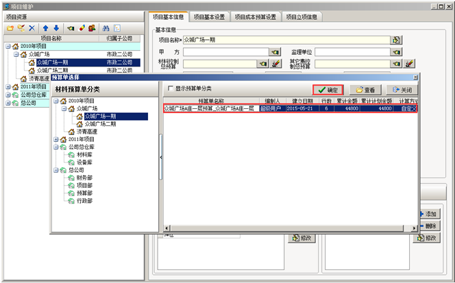 第一步,工程項目材料預算添加并保存完成之后,要將對應的預算單與項目綁定對應。進入系統的【工程管理】模塊,點擊【項目維護】,選擇對應的項目,點擊[編輯項目信息],點擊[選擇]的按鈕,選中對應的預算單,點擊[確定]按鈕,預算單綁定到對應的項目中。