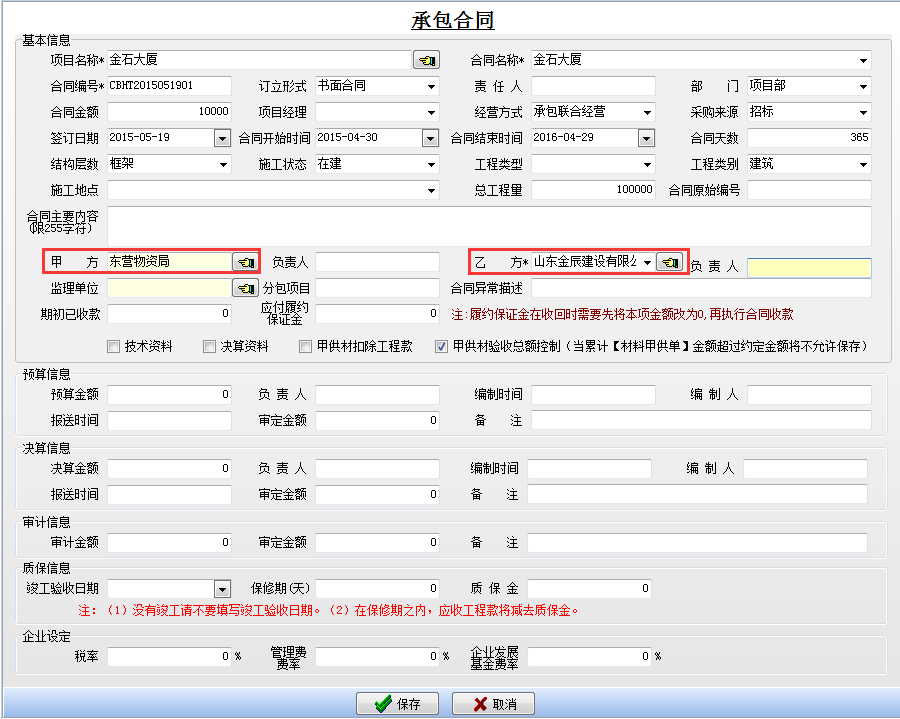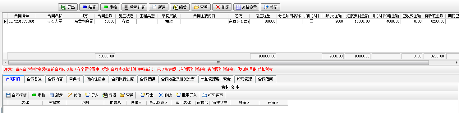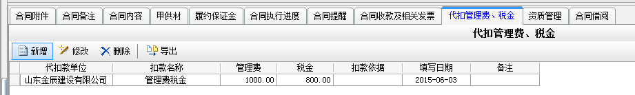 在工程項目資質(zhì)掛靠管理中因為借用乙方B的資質(zhì),需要扣除管理費(fèi),如果需要乙方B代開發(fā)票還需要扣除稅金。在承包合同中[代扣管理費(fèi)稅金]模塊下操作,如下圖:
