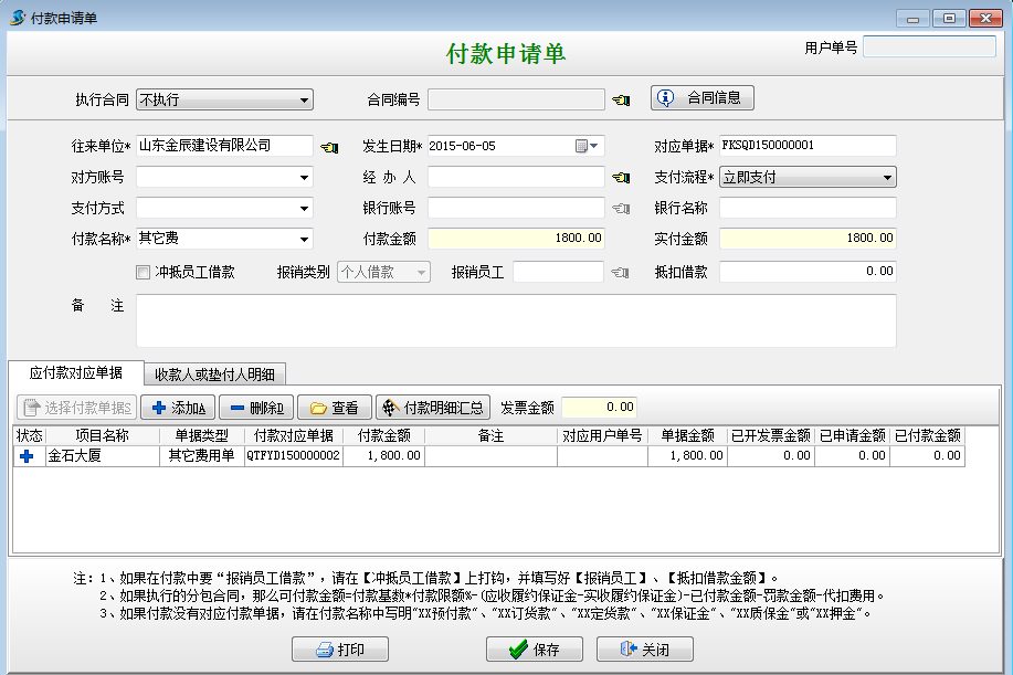 在工程項目資質(zhì)掛靠管理中因為借用乙方B的資質(zhì)或者乙方B代開發(fā)票需要向乙方B支付管理費(fèi)和稅金。這時我們需要做其他費(fèi)用單在做付款申請單或者付款單,具體操作如下: