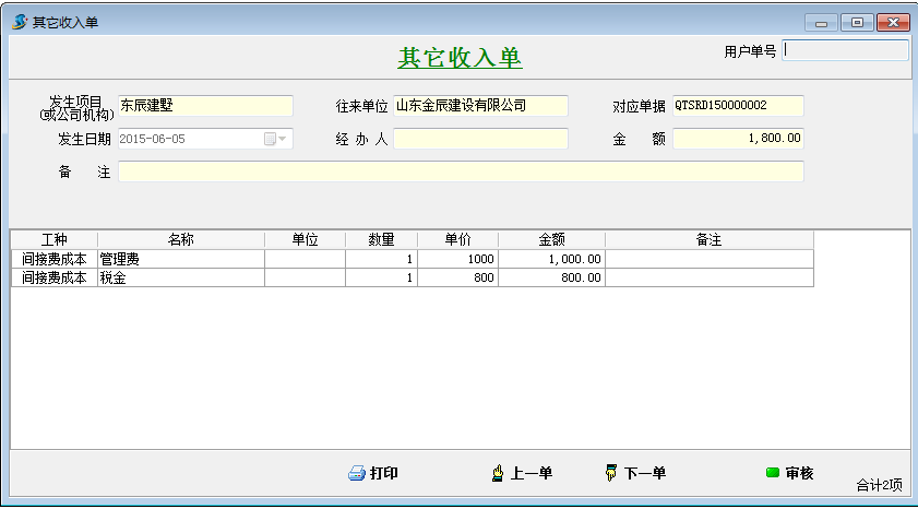 在工程項目資質(zhì)掛靠管理中甲方直接把承包款支付給借資質(zhì)公司(乙方B),我公司不會跟甲方產(chǎn)生往來賬款。由于是借的我方的資質(zhì),乙方B需要向我公司支付管理費(fèi)或者稅金。通過其它收入單來記錄這筆費(fèi)用。如下圖: