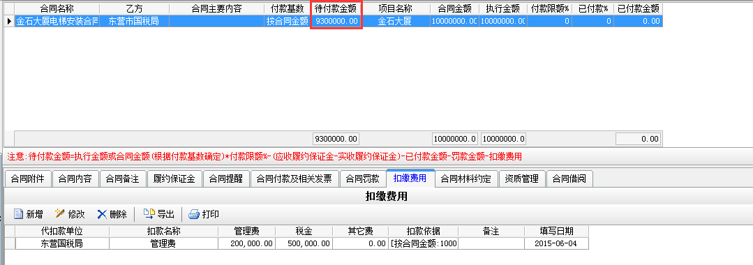 在工程項目資質(zhì)掛靠管理中乙方B借用乙方A的資質(zhì),乙方A需要扣除乙方B管理費(fèi),如果需要乙方A代開發(fā)票還需要扣除稅金。在分包合同中[扣繳費(fèi)用]模塊下操作,如下圖: