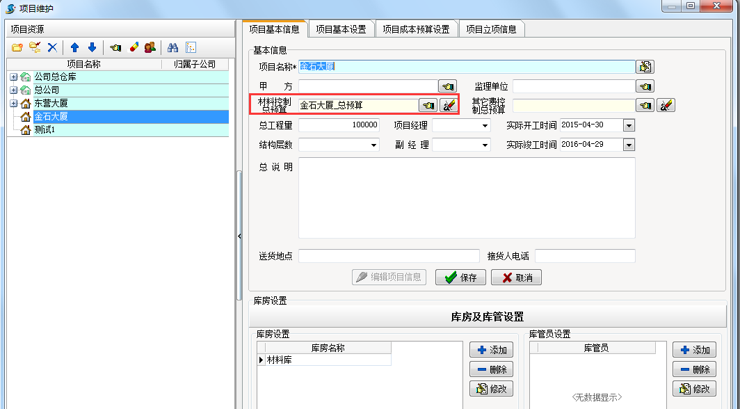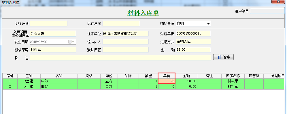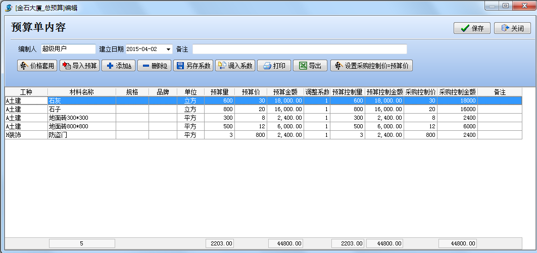 如圖在工程項(xiàng)目管理系統(tǒng)中建立一個(gè)金石大廈的材料預(yù)算單