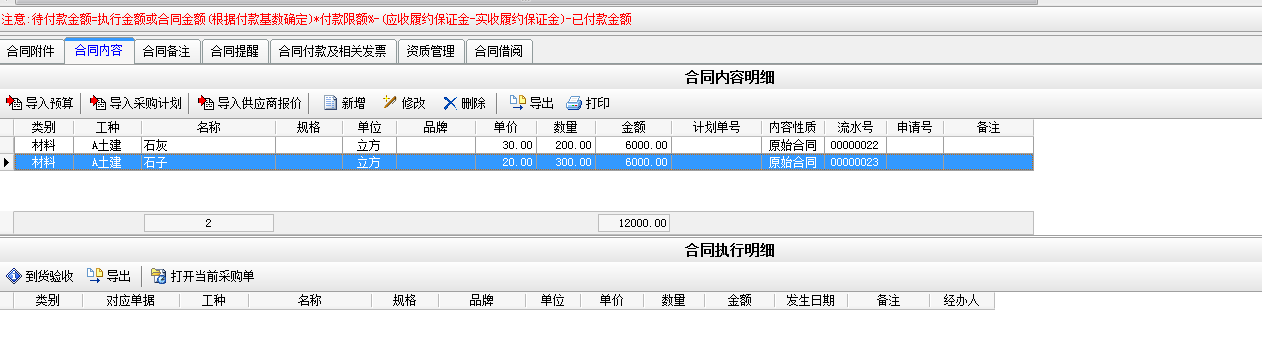 例如我們做一個(gè)采購(gòu)石灰和石子的采購(gòu)合同,合同總價(jià)為12000。如下圖;