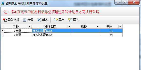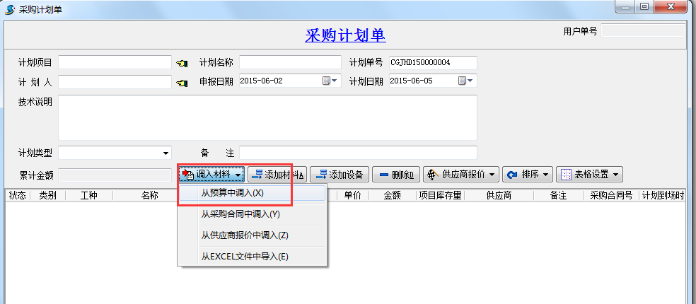 在工程項(xiàng)目管理系統(tǒng)中新建采購(gòu)計(jì)劃單時(shí),添加材料內(nèi)容選擇從預(yù)算中調(diào)入,如下圖
