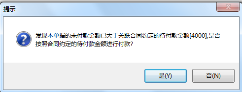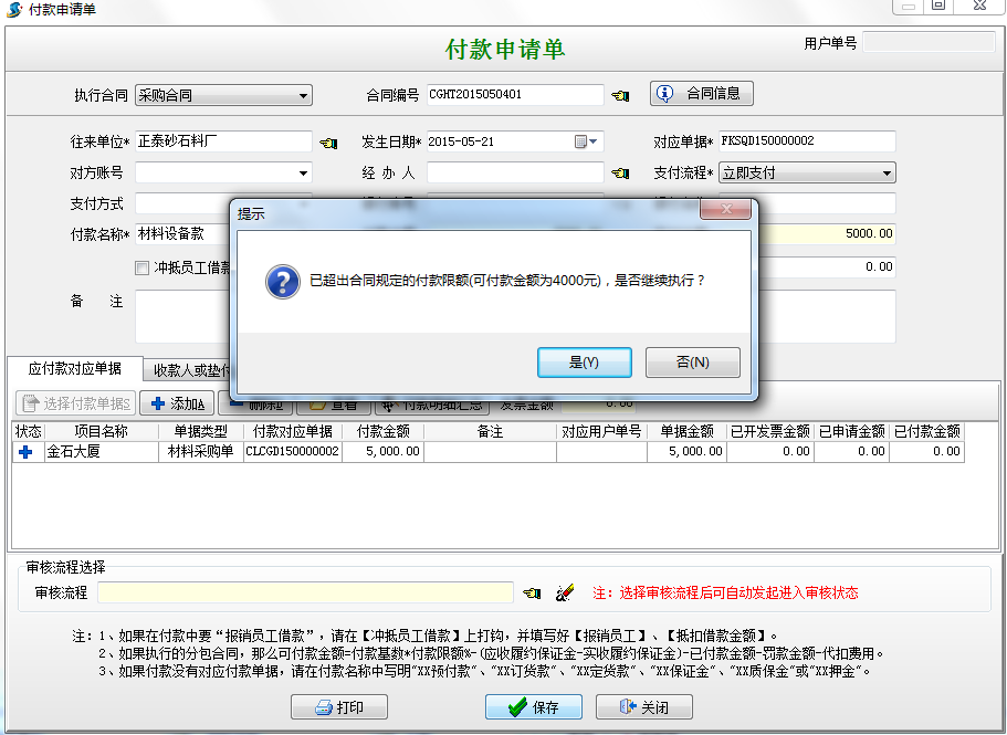 當(dāng)我們選擇是時(shí),生成付款為4000的付款申請(qǐng)單;當(dāng)選擇否時(shí),生成5000的付款申請(qǐng)單,當(dāng)保存單據(jù)時(shí)軟件也會(huì)提示超過了付款限額。如圖
