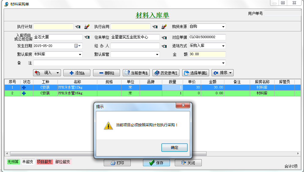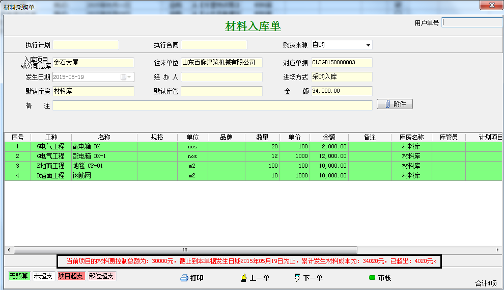 在工程項(xiàng)目管理系統(tǒng)中填入材料入庫(kù)單、其他入庫(kù)單成本控制金額,當(dāng)超過該金額時(shí),系統(tǒng)會(huì)自動(dòng)提示。假如我們成本控制金額填入30000我們?cè)谛落浫氩牧先霂?kù)單、其他入庫(kù)單時(shí)超過控制金額30000會(huì)自動(dòng)提示。這里咱們一采購(gòu)入庫(kù)單為例,如下圖