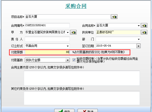 即在工程項(xiàng)目管理系統(tǒng)中新建采購(gòu)合同時(shí)填寫好付款限額。如下圖: