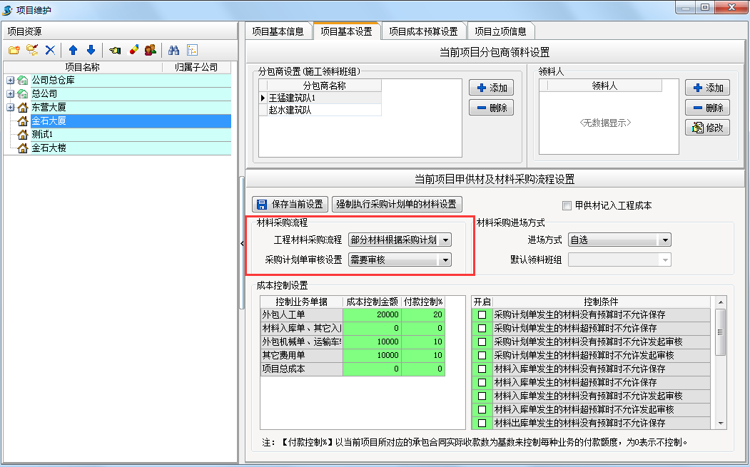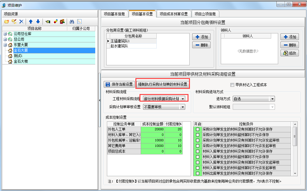 在【工程管理】模塊?【項(xiàng)目維護(hù)】項(xiàng)目基本設(shè)置可以設(shè)置采購(gòu)計(jì)劃單,材料入庫(kù)單,材料出庫(kù)單,材料調(diào)撥單強(qiáng)制執(zhí)行材料預(yù)算單。如下圖