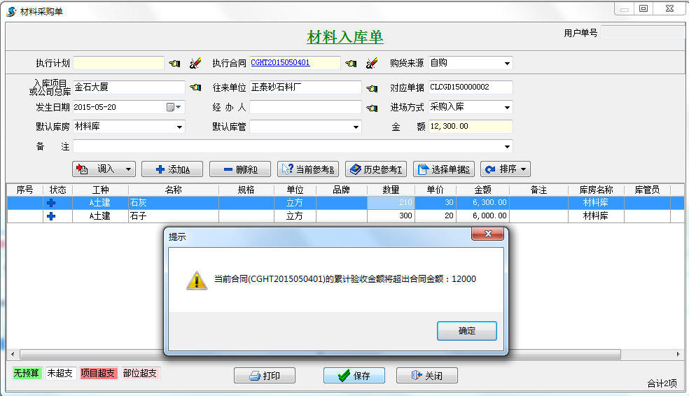 在工程項(xiàng)目管理系統(tǒng)中當(dāng)我們驗(yàn)收金額超過總額時(shí)系統(tǒng)會(huì)自動(dòng)提示,并且材料采購(gòu)單不能保存。如下圖