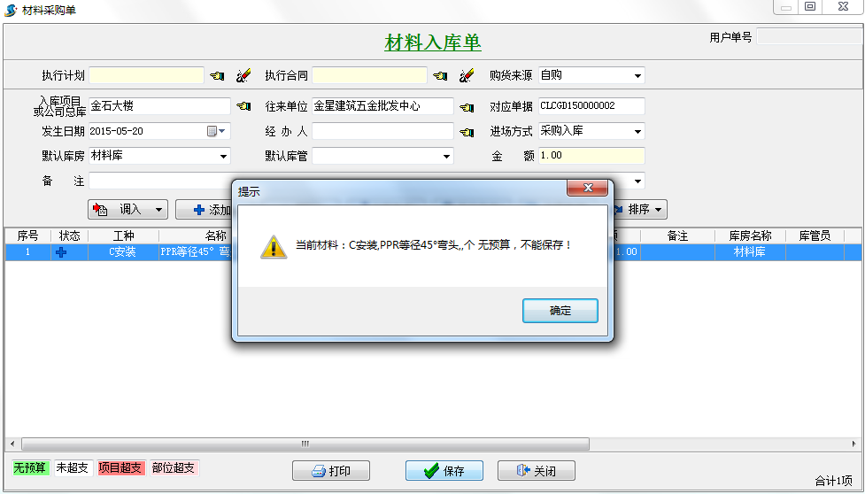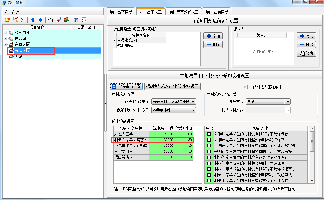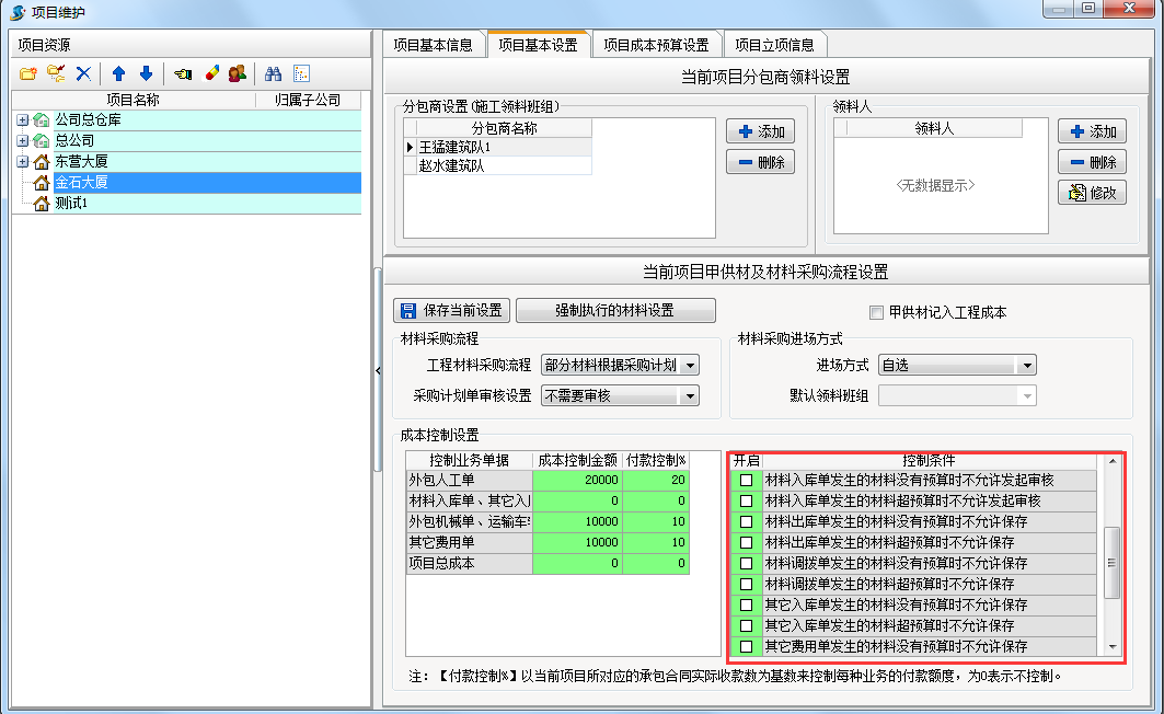 在工程項(xiàng)目管理系統(tǒng)中選好控制條件在開啟處打上勾。例如我們選定材料入庫(kù)單發(fā)生的材料沒有預(yù)算不能允許保存。