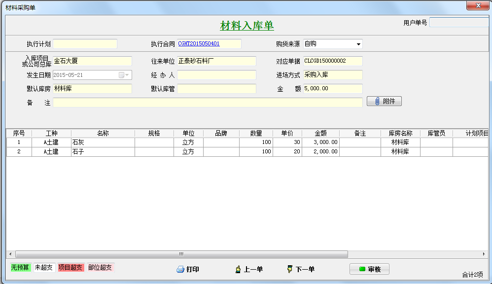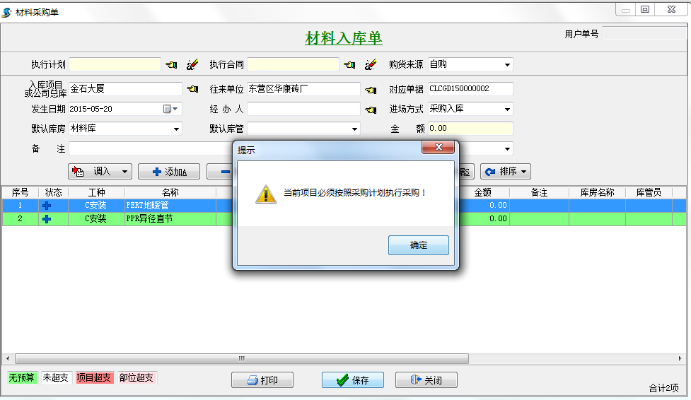 在填寫工程項(xiàng)目采購(gòu)計(jì)劃單,材料入庫(kù)單,材料出庫(kù)單,材料調(diào)撥單時(shí)都會(huì)根據(jù)預(yù)算單來(lái)進(jìn)行相應(yīng)的顏色提示。