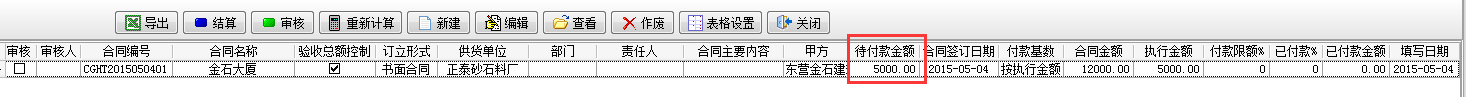 當(dāng)我們完成石子和石灰個(gè)100立方的驗(yàn)收后待付款金額則顯示驗(yàn)收金額。如下圖: