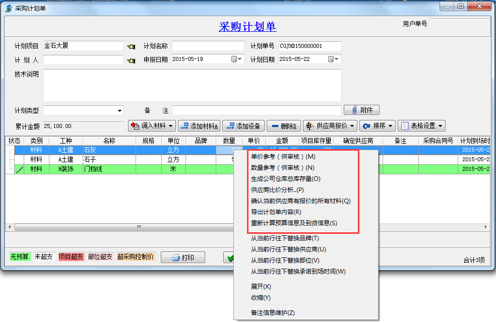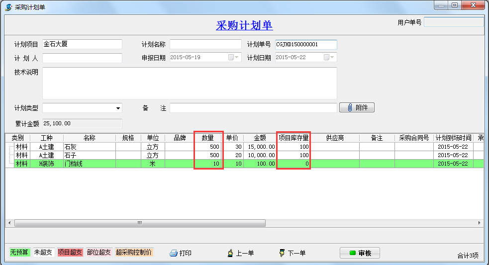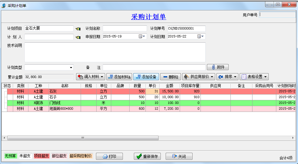 綁定好項(xiàng)目之后,在填寫材料相關(guān)單據(jù)時(shí),會(huì)根據(jù)預(yù)算單的價(jià)格和數(shù)量進(jìn)行不同顏色的顯示。這里我們以采購(gòu)計(jì)劃單為例進(jìn)行說(shuō)明。
