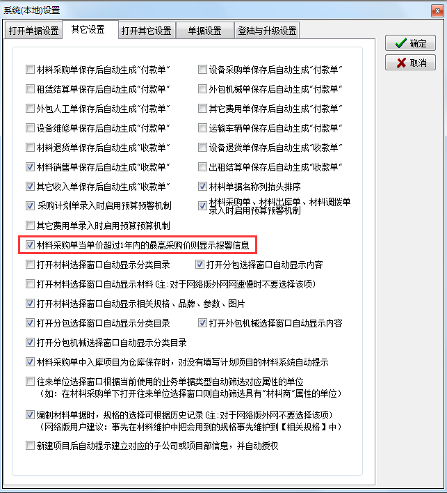 備注:獲得此項(xiàng)提示需要打開開關(guān)【系統(tǒng)維護(hù)】-【系統(tǒng)本機(jī)設(shè)置】-[其他設(shè)置]- 在[材料采購(gòu)單當(dāng)單價(jià)超過一年內(nèi)的最高采購(gòu)價(jià)則顯示報(bào)警信息]處打上勾 。如下圖