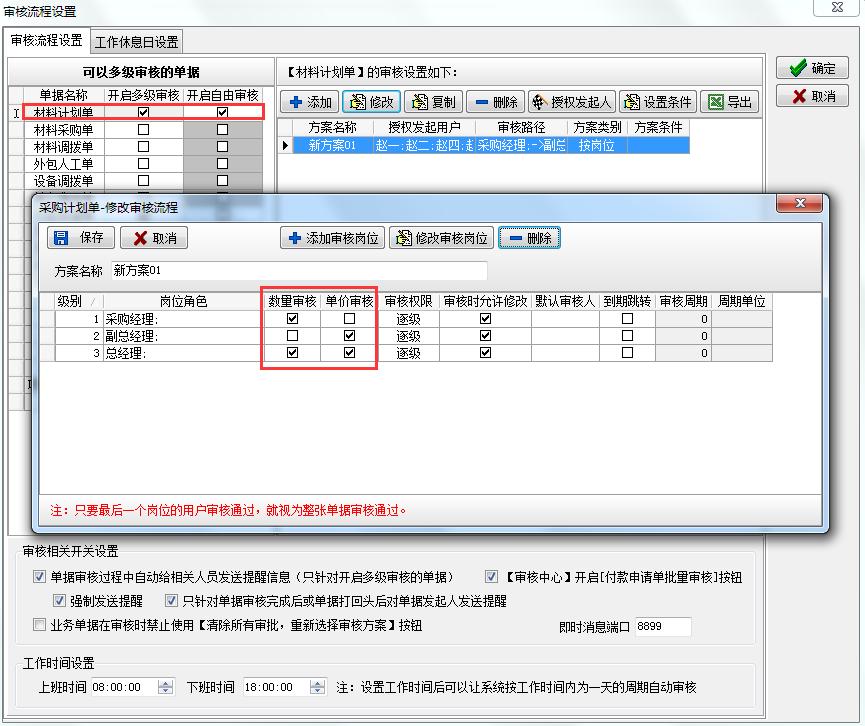 具體設(shè)置方法:材料計(jì)劃單審核設(shè)置為:需要審核。材料采購(gòu)流程又為:根據(jù)采購(gòu)計(jì)劃單或者部分材料根據(jù)采購(gòu)計(jì)劃單