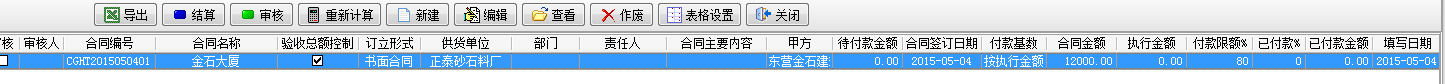 我們建立一個(gè)總價(jià)為12000的采購(gòu)合同,付款基數(shù)按執(zhí)行金額,付款限額為80%。如下圖