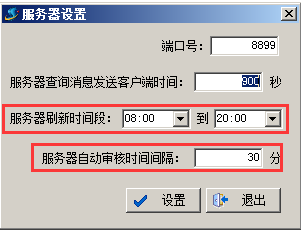 手機服務器端設置刷新時間,在電腦的右下角找到手機服務器端的圖標點擊鼠標右鍵,選擇“服務器設置”,在彈出的“服務器設置”對話框中設置“服務器刷新時間段”以及“服務器自動審核時間間隔”,如圖:
