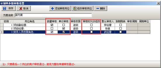 崗位角色以及用戶添加完成之后分別授權給相應的用戶(數量或者單價),或設置審核時可修改,設置完成之后點擊“保存”的按鈕,審核方案設置完成之后則授權發起人(按人名或者按崗位),在授權用戶的復選框內打勾即可,如果授權給“公共用戶”則在“公共用戶”的復選框內打鉤,被授權的用戶可在創建單據的時候選擇多級審核方案,如圖: