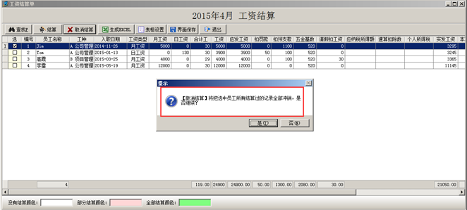 如果想取消結算,則選中對應的員工工資信息,點擊“取消結算”的按鈕,確認取消結算,則員工工資信息會恢復到未結算狀態,如圖: