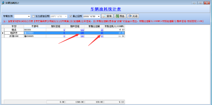 注:當(dāng)前查詢的時(shí)間段必須有【其他費(fèi)用單】明細(xì)發(fā)生過(guò)[車輛]及[加油費(fèi)]業(yè)務(wù)信息,且[本期加油量]是根據(jù)“數(shù)量”欄目合計(jì)得出,本期加油量(L/100KM)=本期加油量/[(期末里程—期初里程)/100]