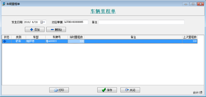 注:三個(gè)單據(jù)中“上次里程數(shù)”,系統(tǒng)自動(dòng)檢索之前最近的一個(gè)單據(jù)的“當(dāng)時(shí)里程數(shù)”,如果沒(méi)有最近的單據(jù)則為【內(nèi)部車輛維護(hù)】中所填寫(xiě)的“期初里程數(shù)”。