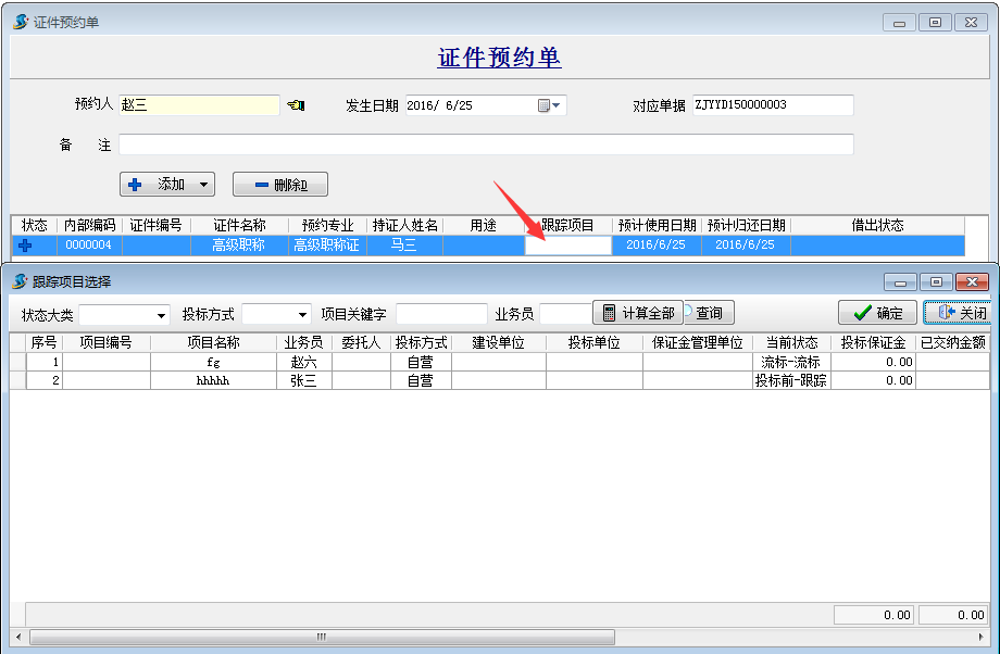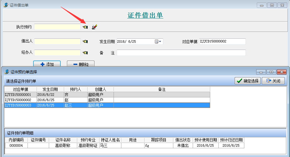 證件借出單可以選擇執行我們上一步所演示的預約和需要跟蹤的項目