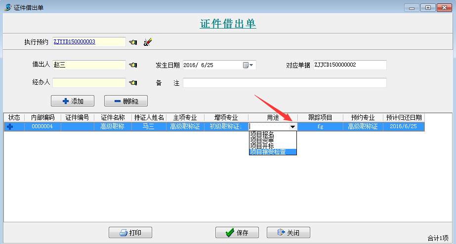 還可以選擇借出證件的用途“項目報名”、“項目資審”、“項目開標”、“項目接受檢查”