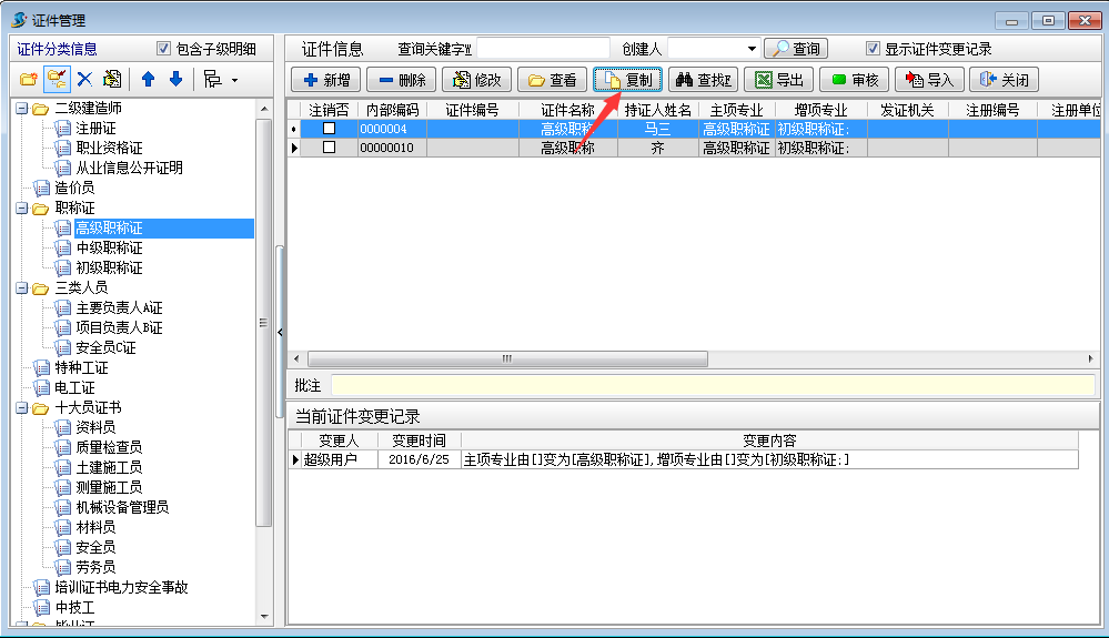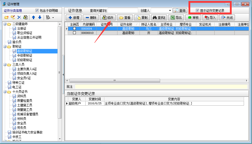 顯示證件變更記錄打勾,選擇修改(主要用于增加證件專業、所屬部門等信息的變更)