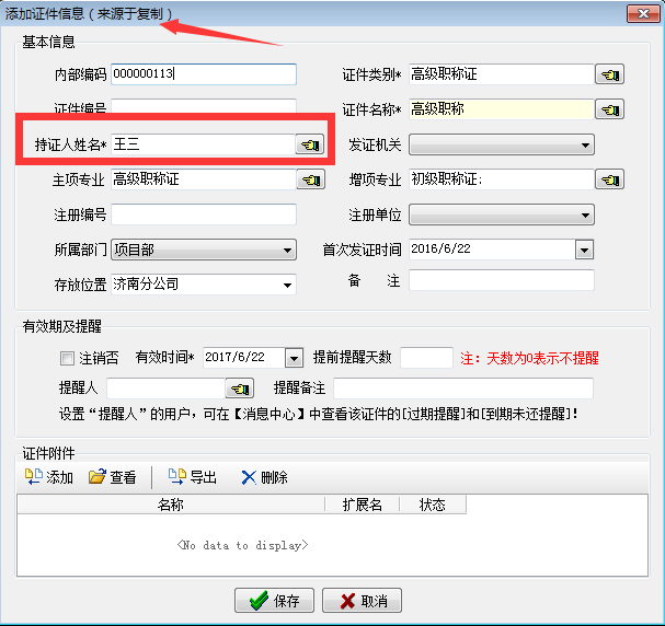 如下圖所示:證件管理的所屬部門已經由[項目部]變更為我們剛剛修改的[市場部]了