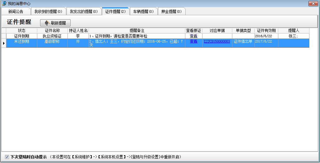 添加提醒人和提前提醒天數后,證件到期需要年檢或到期未還,提醒人會收到軟件的提醒信息,點下圖中藍色字體可以“查看原證”和“對應單據”