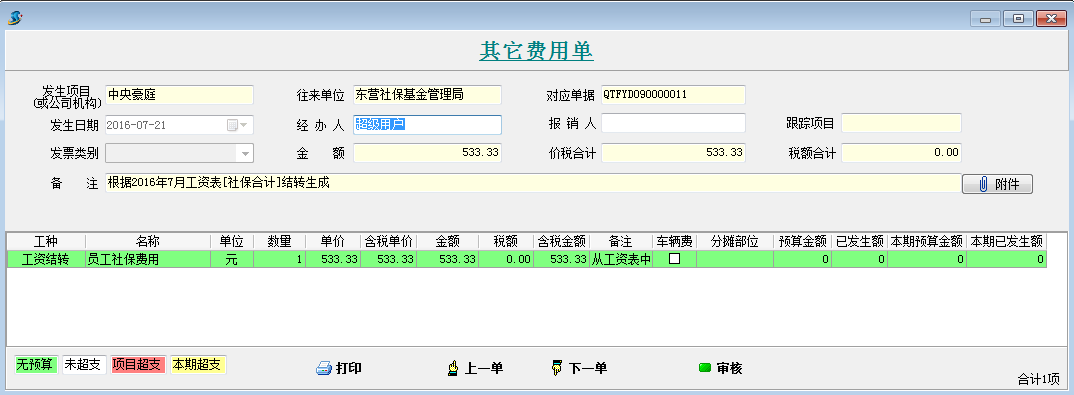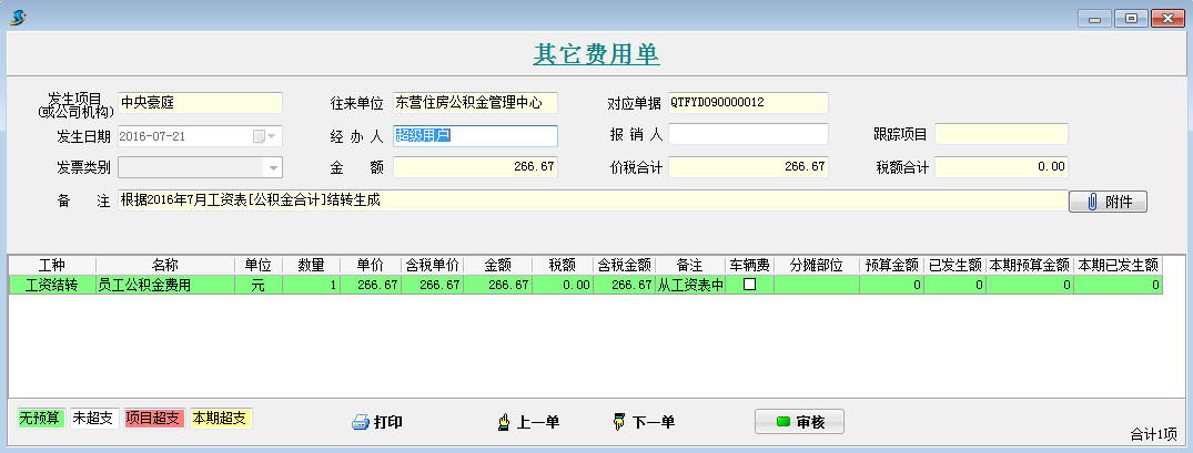 打開待攤費用模塊,選擇好分攤科目,列表中就會顯示出每個項目分攤客戶的明細。同時在這個模塊可以直接生成其它費用單,選擇好社保合計和公積金合計的對應其它費用單科目和對應往來單位,點擊生成工程項目管理系統【其它費用單】,直接可以生成四張其他費用單。
