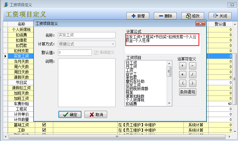 2. 然后在工程項目管理系統【員工管理】-【工資項目定義】設定好實發工資的公式和新增社保合計,公積金合計兩個工資科目。其中實發工資公式中要減去個人社保和個人公積金。如下圖: