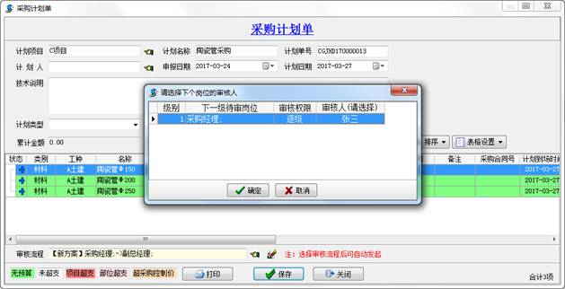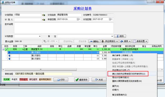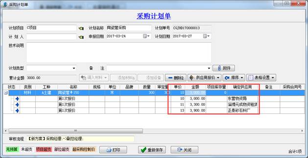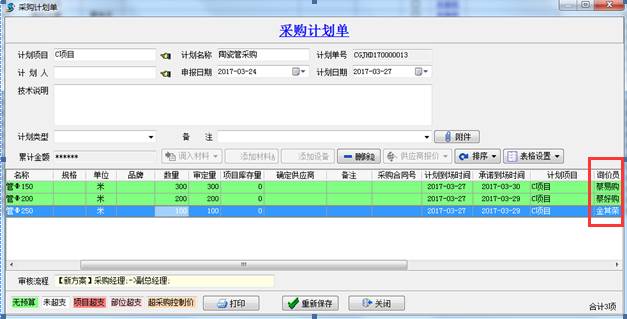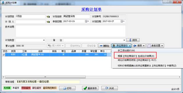 2、新建采購計劃單,選擇項目、輸入計劃名稱和添加材料后,選擇審核方案à新方案。如下圖,
