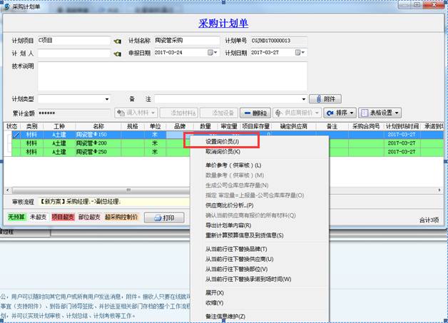在彈出的待審核單據à材料計劃單,點擊修改按鈕,彈出材料計劃單,在材料行位置右擊鼠標,對特定材料設置詢價員,操作如下