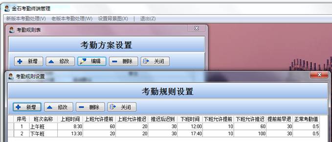 點(diǎn)擊新增,增加新的考勤方案,然后點(diǎn)擊修改,設(shè)置方案中各個(gè)參數(shù)。