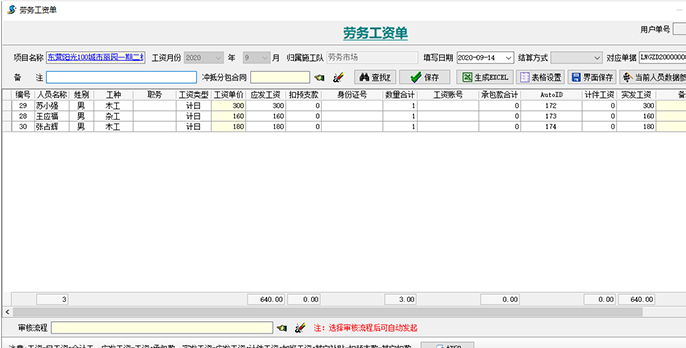 1、項目部以【勞務(wù)考勤單】為勞務(wù)進出場的日報,需每日完成。月底根據(jù)【勞務(wù)考勤單】生成月度工資表進行結(jié)算