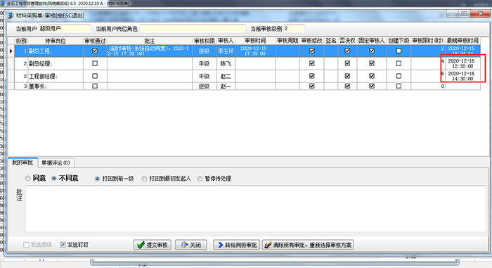 在上述設置完成之后,用戶就可以在金石項目管理軟件的頂部導航【系統】-【審核流程設置】試用自動審核功能了。