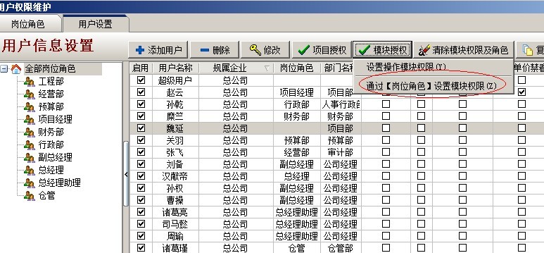 回到用戶設(shè)置模塊,選中要授權(quán)的用戶后點(diǎn)擊【模塊授權(quán)】,選第二項(xiàng)【通過崗位角色設(shè)置模塊權(quán)限】來對(duì)操作用戶設(shè)置崗位權(quán)限。