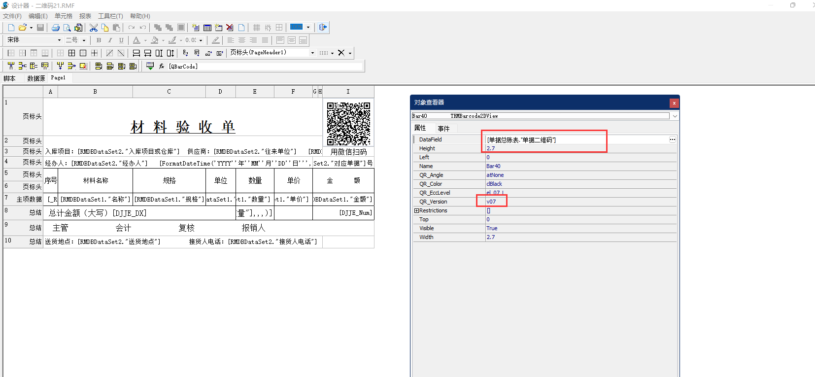 3、設(shè)置好二維碼樣式之后右鍵點(diǎn)擊單元格,點(diǎn)擊屬性。設(shè)置字符來源(datafield)為“[單據(jù)總賬表."單據(jù)二維碼"]”,二維碼版本(QR_vesion)為:v07
