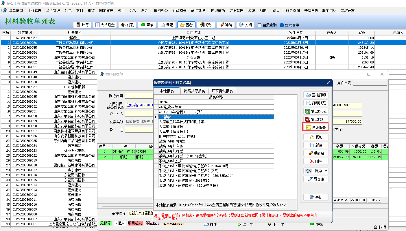 1、打開材料驗(yàn)收單列表,找到單據(jù)點(diǎn)擊查看后點(diǎn)擊打印按鈕。找到常用報(bào)表點(diǎn)擊設(shè)計(jì)報(bào)表。