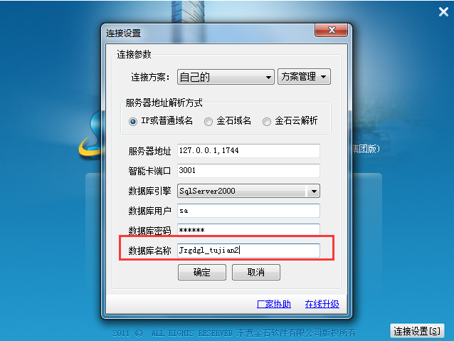 2.打開金石客戶端→連接設(shè)置,更改下數(shù)據(jù)庫(kù)名稱為我們還原的數(shù)據(jù)庫(kù)名稱Jzgdgl_TuJian2